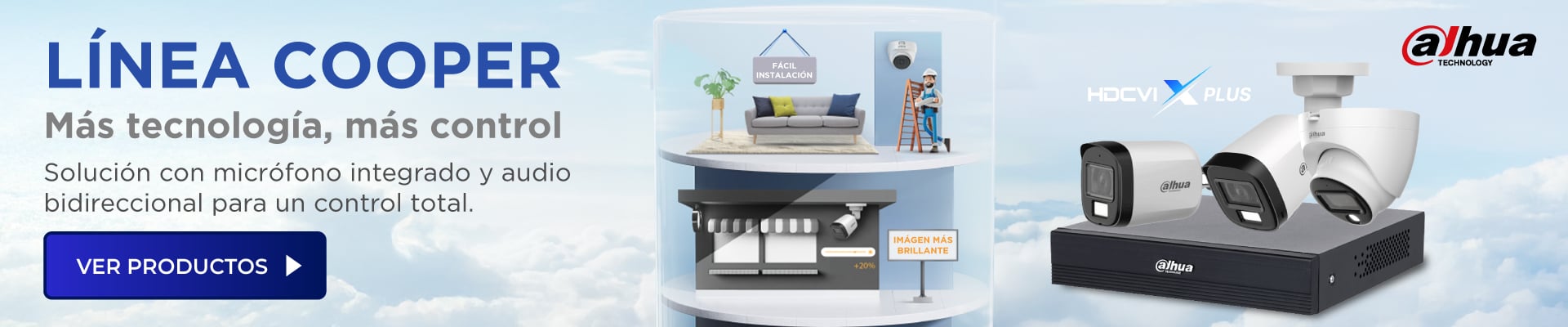 DAHUA KITXVR1B04-I+HFW1200CMA -Kit de 4 canales con cámaras de 2MP y audio. Incluye DVR Cooper-I WizSense con IA y H.265+, 4 cámaras metálicas con micrófono integrado, 4 canales más 1IP o hasta 5 canales IP, 4 canales SMD Plus y accesorios incluidos/